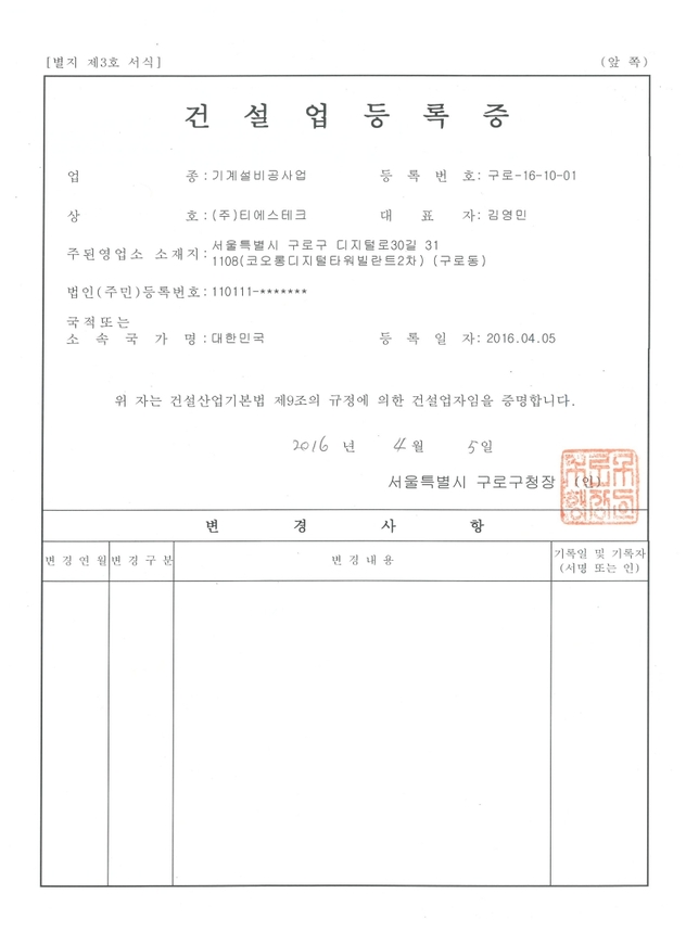Construction business registration certificate (Mechanical equipment works)